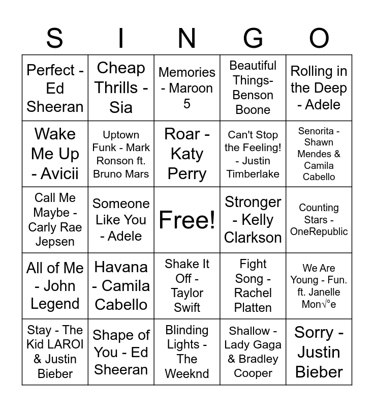This bingo card has a free space and 41 words: Happy - Pharrell Williams, Call Me Maybe - Carly Rae Jepsen, Firework - Katy Perry, Uptown Funk - Mark Ronson ft. Bruno Mars, Shape of You - Ed Sheeran, Shake It Off - Taylor Swift, Roar - Katy Perry, Just the Way You Are - Bruno Mars, Rolling in the Deep - Adele, All of Me - John Legend, Someone Like You - Adele, Beautiful Things- Benson Boone, Sorry - Justin Bieber, Counting Stars - OneRepublic, Stronger - Kelly Clarkson, Havana - Camila Cabello, Sugar - Maroon 5, Perfect - Ed Sheeran, Bad Guy - Billie Eilish, Memories - Maroon 5, We Are Young - Fun. ft. Janelle Mon√°e, Royals - Lorde, Blinding Lights - The Weeknd, Can't Stop the Feeling! - Justin Timberlake, Lose Control- Teddy Swims, Drivers License - Olivia Rodrigo, Shallow - Lady Gaga & Bradley Cooper, Watermelon Sugar - Harry Styles, Senorita - Shawn Mendes & Camila Cabello, Levitating - Dua Lipa, Love Yourself - Justin Bieber, Cheap Thrills - Sia, Stay - The Kid LAROI & Justin Bieber, Nice to Meet You- Myles Smith, Fight Song - Rachel Platten, Wake Me Up - Avicii, Girls Like You - Maroon 5 ft. Cardi B, What Makes You Beautiful - One Direction, Happy Together - The Turtles, I Gotta Feeling - The Black Eyed Peas and Too Sweet- Hozier.