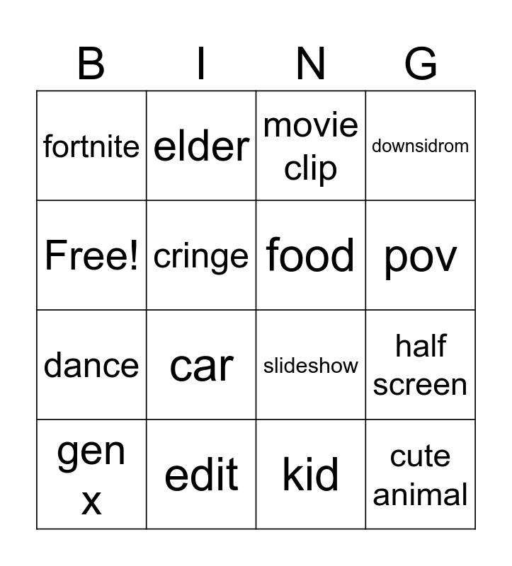 This bingo card has 16 words: edit, half screen, movie clip, fortnite, dance, elder, slideshow, kid, Free!, cringe, gen x, downsidrom, car, pov, food and cute animal.
