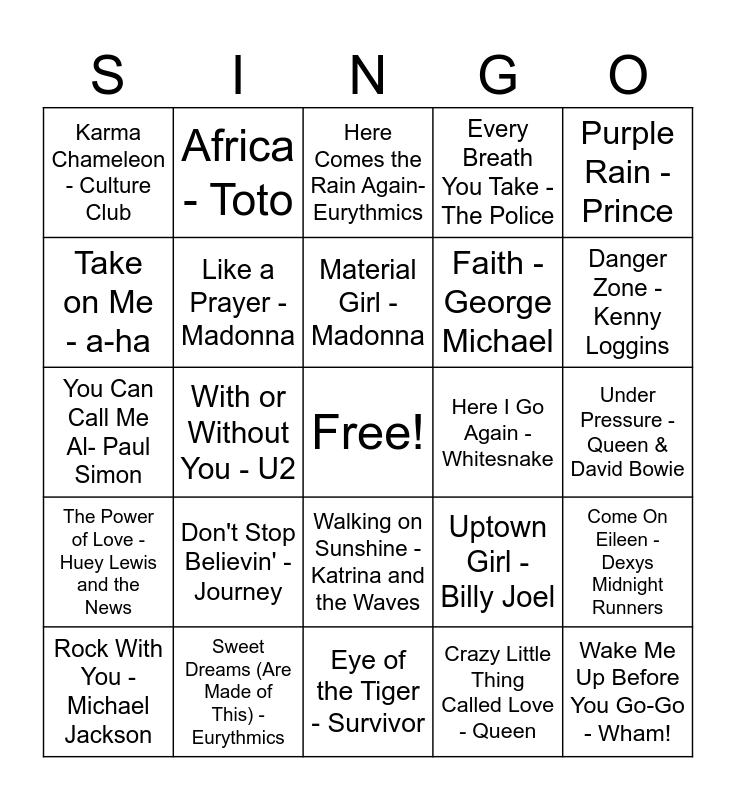 This bingo card has a free space and 46 words: Footloose - Kenny Loggins, Wake Me Up Before You Go-Go - Wham!, Girls Just Want to Have Fun - Cyndi Lauper, Eye of the Tiger - Survivor, Don't Stop Believin' - Journey, Livin' on a Prayer - Bon Jovi, Africa - Toto, Billie Jean - Michael Jackson, Take on Me - a-ha, Sweet Child O' Mine - Guns N' Roses, Like a Prayer - Madonna, Every Breath You Take - The Police, Come On Eileen - Dexys Midnight Runners, Uptown Girl - Billy Joel, Jump - Van Halen, I Want to Dance with Somebody - Whitney Houston, Material Girl - Madonna, Here I Go Again - Whitesnake, Time After Time - Cyndi Lauper, Purple Rain - Prince, With or Without You - U2, Crazy Little Thing Called Love - Queen, Karma Chameleon - Culture Club, Faith - George Michael, Heaven Is a Place on Earth - Belinda Carlisle, Danger Zone - Kenny Loggins, Rock With You - Michael Jackson, Maniac - Michael Sembello, Walking on Sunshine - Katrina and the Waves, The Power of Love - Huey Lewis and the News, I Ran (So Far Away) - A Flock of Seagulls, You Spin Me Round (Like a Record) - Dead or Alive, Love Shack - The B-52's, She Drives Me Crazy - Fine Young Cannibals, What's Love Got to Do With It - Tina Turner, Sweet Dreams (Are Made of This) - Eurythmics, Under Pressure - Queen & David Bowie, Never Gonna Give You Up - Rick Astley, La Bamba-, Me Myself and I- De La Soul, St. Elmos Fire- John Parr, Here Comes the Rain Again- Eurythmics, You Can Call Me Al- Paul Simon, Bette Davis Eyes- Missing Persons, Any Way You Want It- Journey and Nothing's Gonna Stop Us Now- Starship.