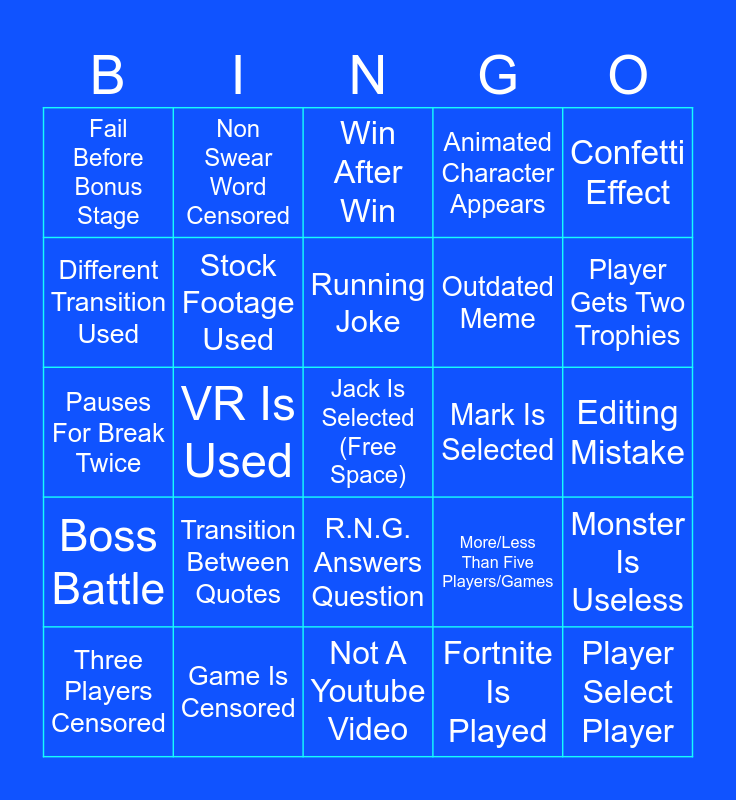 This bingo card has a free space and 29 words: Three Players Censored, Bonus Stage Is One Player, VR Is Used, Quote Repeated More Than Twice, Fail Before Bonus Stage, Win After Win, Stock Footage Used, Transition Between Quotes, Mark Is Selected, Game Is Censored, Editing Mistake, Player Select Player, Not A Youtube Video, Fortnite Is Played, Player Gets Two Trophies, Nothing Burger, R.N.G. Answers Question, Boss Battle, Confetti Effect, Pauses For Break Twice, More/Less Than Five Players/Games, Player Appears In Another Playthrough, Outdated Meme, Different Transition Used, Animated Character Appears, Non Swear Word Censored, Monster Is Useless, Running Joke and Barely Any Visual Edits.