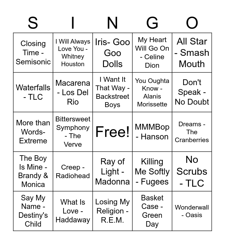 This bingo card has a free space and 47 words: Smells Like Teen Spirit - Nirvana, Wonderwall - Oasis, Baby One More Time - Britney Spears, Losing My Religion - R.E.M., Creep - Radiohead, Black or White - Michael Jackson, I Will Always Love You - Whitney Houston, Torn - Natalie Imbruglia, Waterfalls - TLC, Wannabe - Spice Girls, Macarena - Los Del Rio, My Heart Will Go On - Celine Dion, No Scrubs - TLC, Killing Me Softly - Fugees, Ironic - Alanis Morissette, Semi-Charmed Life - Third Eye Blind, I Want It That Way - Backstreet Boys, MMMBop - Hanson, Barbie Girl - Aqua, All Star - Smash Mouth, Bittersweet Symphony - The Verve, Basket Case - Green Day, Closing Time - Semisonic, You Oughta Know - Alanis Morissette, Livin' la Vida Loca - Ricky Martin, Don't Speak - No Doubt, Say My Name - Destiny's Child, Virtual Insanity - Jamiroquai, Ray of Light - Madonna, The Boy Is Mine - Brandy & Monica, Genie in a Bottle - Christina Aguilera, I'm Gonna Be (500 Miles)- The Proclaimers, Jump - Kris Kross, Believe - Cher, Two Princes - Spin Doctors, What Is Love - Haddaway, Dreams - The Cranberries, The Freshmen - The Verve Pipe, Slide - Goo Goo Dolls, Bye Bye Bye- NSync, Always Be My Baby- Mariah Carey, Iris- Goo Goo Dolls, More than Words- Extreme, Give me one reason- Tracy Chapman, Gangsta's Paradise- Coolio, Tearin' Up My Heart- Nsync and Ice Ice Baby- Vanilla Ice.