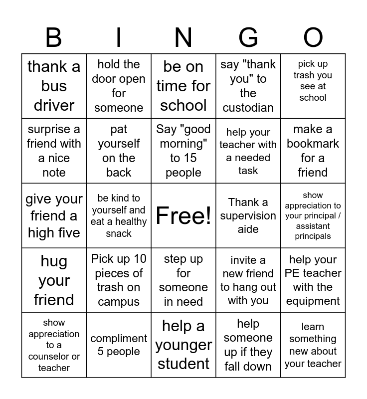 This bingo card has a free space and 24 words: Pick up 10 pieces of trash on campus, compliment 5 people, Say "good morning" to 15 people, show appreciation to a counselor or teacher, pick up trash you see at school, thank a bus driver, surprise a friend with a nice note, hold the door open for someone, Thank a supervision aide, step up for someone in need, help your teacher with a needed task, give your friend a high five, invite a new friend to hang out with you, help your PE teacher with the equipment, pat yourself on the back, help someone up if they fall down, show appreciation to your principal / assistant principals, be on time for school, make a bookmark for a friend, be kind to yourself and eat a healthy snack, learn something new about your teacher, hug your friend, say "thank you" to the custodian and help a younger student.