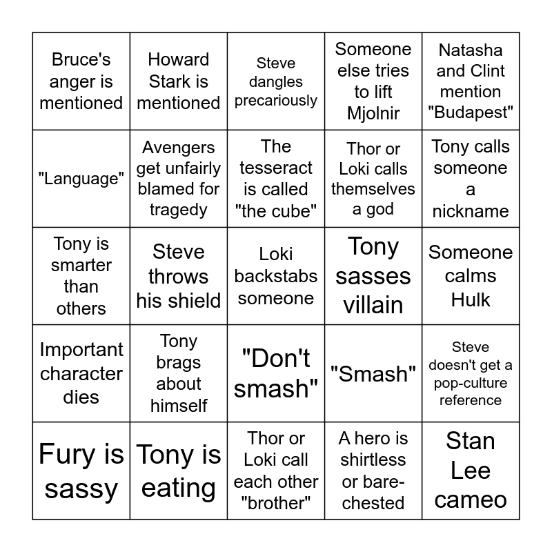 This bingo card has 34 words: Stan Lee cameo, A hero is shirtless or bare-chested, We learn the truth about a character, Avengers cause property damage, Important character dies, Avengers get unfairly blamed for tragedy, Natasha and Clint mention "Budapest", Fury is sassy, Howard Stark is mentioned, Coulson fanboys over Captain America, The tesseract is called "the cube", Steve dangles precariously, Avenger's group pose, "Avengers assemble!", Tony sasses villain, Tony calls someone a nickname, Tony is eating, Tony is smarter than others, Tony brags about himself, "Smash", "Don't smash", Bruce transforms, Bruce's anger is mentioned, Someone calms Hulk, Thor or Loki call each other "brother", Loki backstabs someone, Someone else tries to lift Mjolnir, Thor accidentally breaks something, Thor or Loki calls themselves a god, "Language", Steve looks at his picture of Peggy, Steve throws his shield, Steve doesn't get a pop-culture reference and Someone else catches Steve's shield.