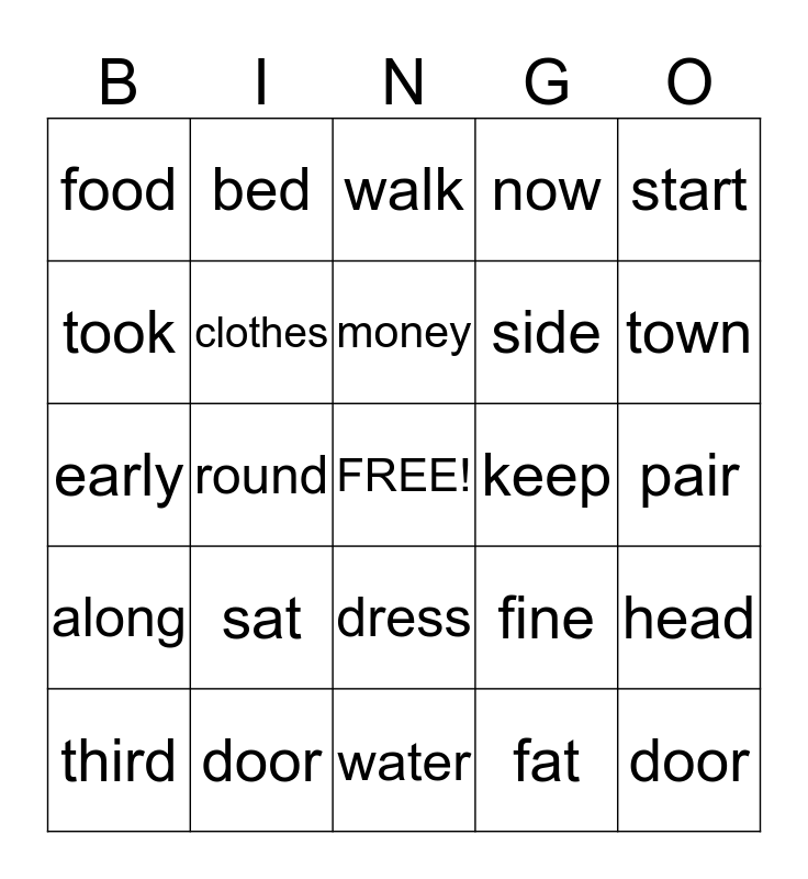 This bingo card has a free space and 24 words: sat, door, money, third, start, food, took, bed, keep, dress, side, early, fine, head, clothes, fat, pair, walk, town, round, door, along, now and water.