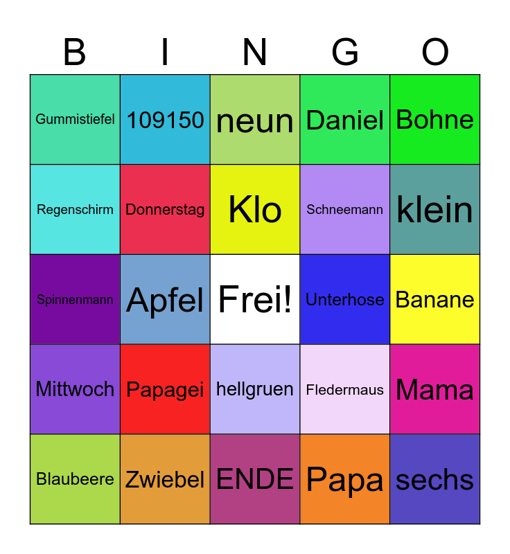 This bingo card has a free space and 24 words: Papagei, Zwiebel, Klo, Blaubeere, Bohne, Gummistiefel, Regenschirm, 109150, Unterhose, hellgruen, Schneemann, Spinnenmann, Fledermaus, Mama, Donnerstag, Papa, Banane, neun, klein, Apfel, sechs, Mittwoch, Daniel and ENDE.