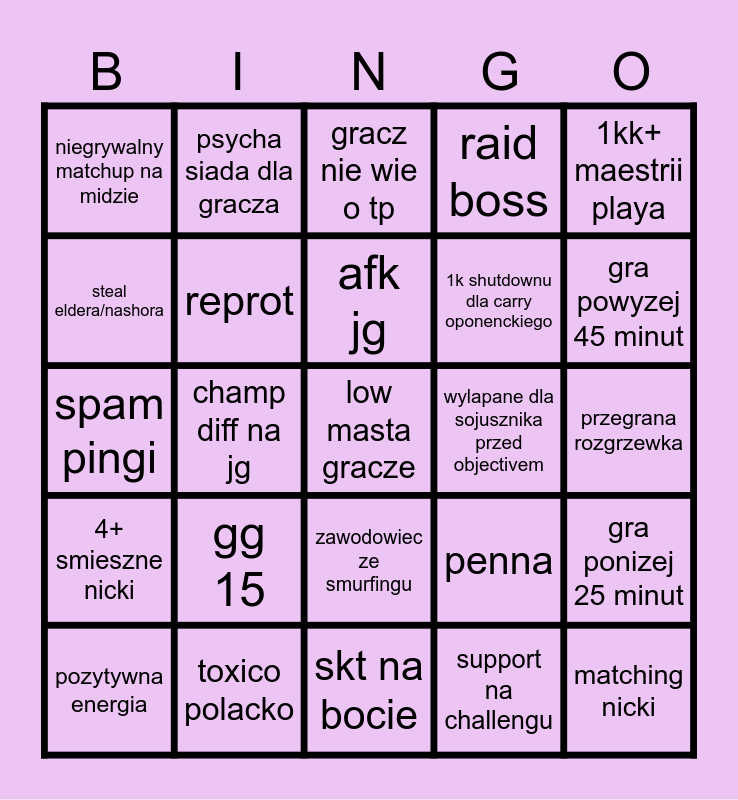 This bingo card has a free space and 26 words: zawodowiec ze smurfingu, support na challengu, afk jg, toxico polacko, 1kk+ maestrii playa, niegrywalny matchup na midzie, steal eldera/nashora, psycha siada dla gracza, przegrana rozgrzewka, penna, 1k shutdownu dla carry oponenckiego, spam pingi, gra ponizej 25 minut, pozytywna energia, champ diff na jg, invade, raid boss, 4+ smieszne nicki, gracz nie wie o tp, matching nicki, gra powyzej 45 minut, skt na bocie, wylapane dla sojusznika przed objectivem, gg 15, reprot and KRADZIEZ CANNONA.
