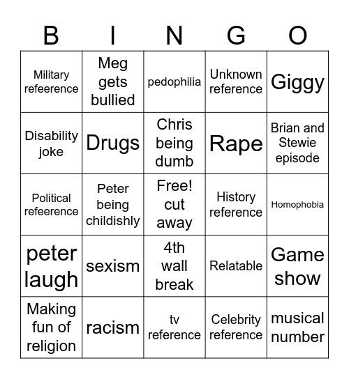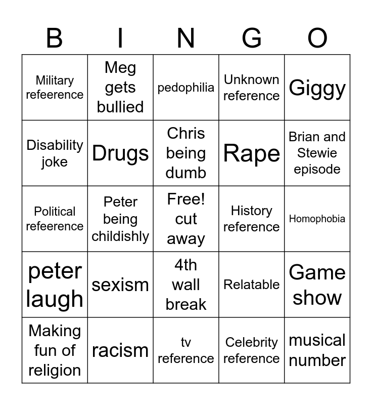 This bingo card has a free space and 24 words: sexism, racism, Chris being dumb, Making fun of religion, Giggy, Military refeerence, Disability joke, Meg gets bullied, History reference, 4th wall break, Rape, Political refeerence, Relatable, Game show, Drugs, Celebrity reference, Homophobia, pedophilia, Brian and Stewie episode, Peter being childishly, musical number, peter laugh, Unknown reference and tv reference.