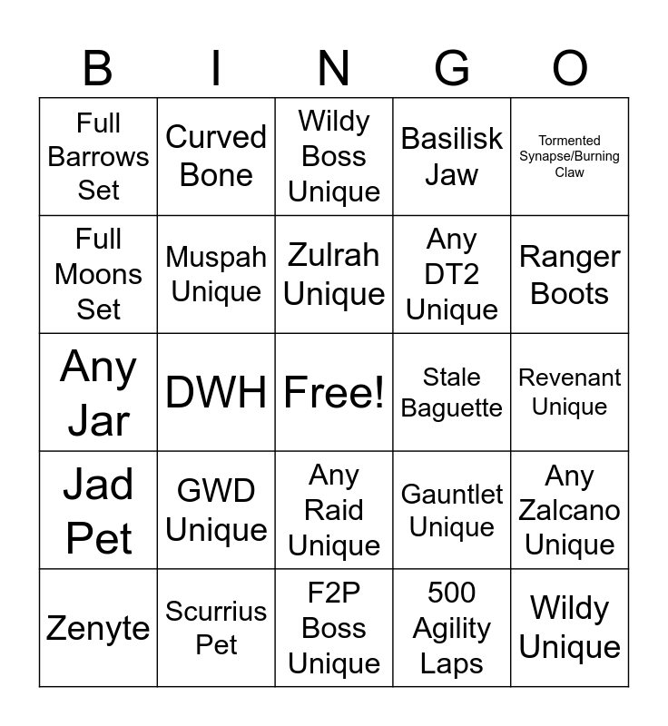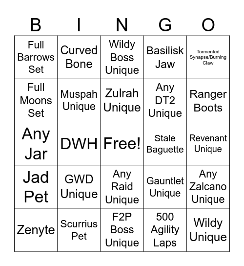 This bingo card has a free space and 24 words: GWD Unique, Scurrius Pet, Zulrah Unique, Zenyte, Tormented Synapse/Burning Claw, Full Barrows Set, Full Moons Set, Curved Bone, Stale Baguette, Any Raid Unique, Any DT2 Unique, Any Jar, Gauntlet Unique, Any Zalcano Unique, Muspah Unique, 500 Agility Laps, Revenant Unique, Wildy Boss Unique, Ranger Boots, DWH, Wildy Unique, Jad Pet, Basilisk Jaw and F2P Boss Unique.
