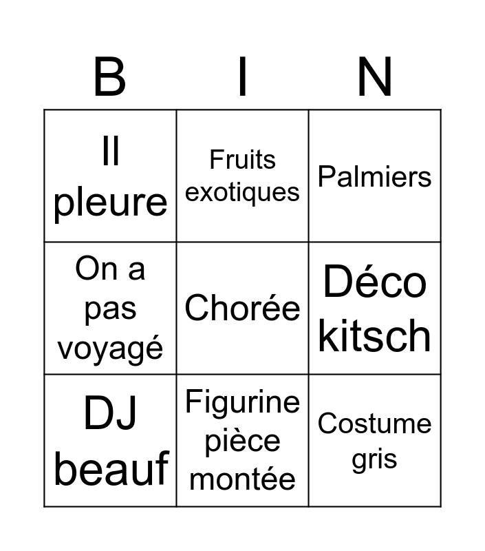 This bingo card has a free space and 8 words: Déco kitsch, Palmiers, Fruits exotiques, DJ beauf, Il pleure, Costume gris, On a pas voyagé and Figurine pièce montée.