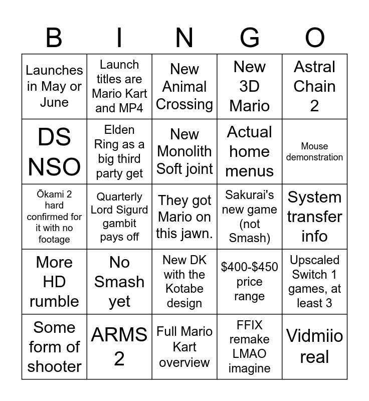 This bingo card has a free space and 24 words: Some form of shooter, No Smash yet, New Monolith Soft joint, FFIX remake LMAO imagine, Astral Chain 2, Launches in May or June, Launch titles are Mario Kart and MP4, New Animal Crossing, Sakurai's new game (not Smash), System transfer info, Ōkami 2 hard confirmed for it with no footage, Elden Ring as a big third party get, $400-$450 price range, Upscaled Switch 1 games, at least 3, DS NSO, ARMS 2, Full Mario Kart overview, New 3D Mario, Mouse demonstration, More HD rumble, Quarterly Lord Sigurd gambit pays off, New DK with the Kotabe design, Actual home menus and Vidmiio real.