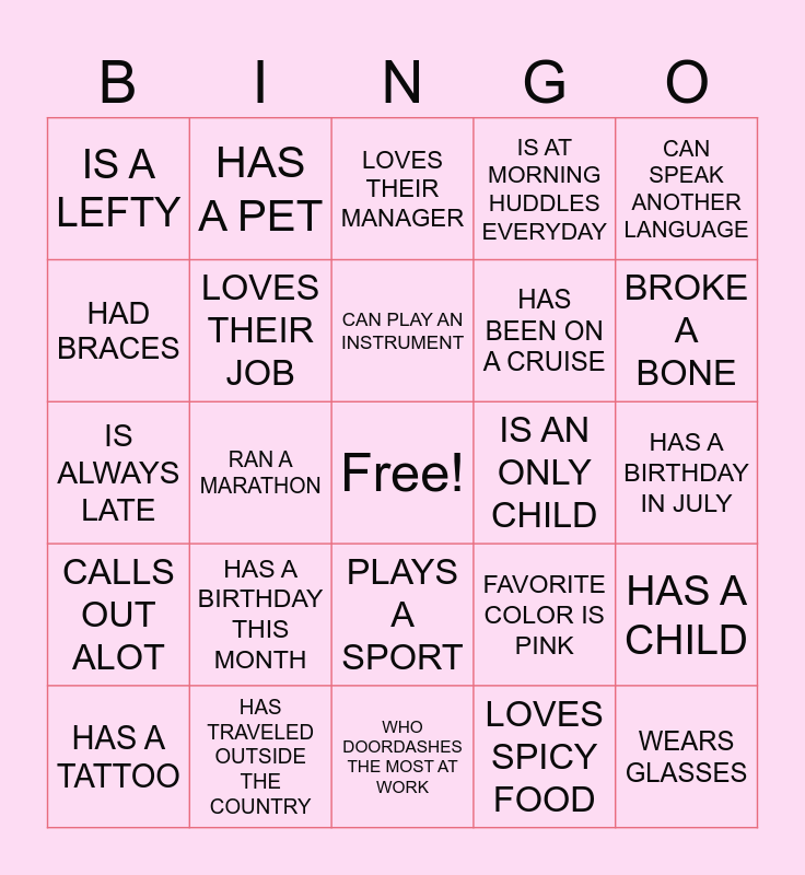 This bingo card has a free space and 24 words: HAS A BIRTHDAY THIS MONTH, HAS TRAVELED OUTSIDE THE COUNTRY, CAN PLAY AN INSTRUMENT, HAS A TATTOO, CAN SPEAK ANOTHER LANGUAGE, IS A LEFTY, HAD BRACES, HAS A PET, IS AN ONLY CHILD, PLAYS A SPORT, HAS BEEN ON A CRUISE, IS ALWAYS LATE, FAVORITE COLOR IS PINK, HAS A CHILD, LOVES THEIR JOB, LOVES SPICY FOOD, HAS A BIRTHDAY IN JULY, LOVES THEIR MANAGER, BROKE A BONE, RAN A MARATHON, WEARS GLASSES, CALLS OUT ALOT, IS AT MORNING HUDDLES EVERYDAY and WHO DOORDASHES THE MOST AT WORK.