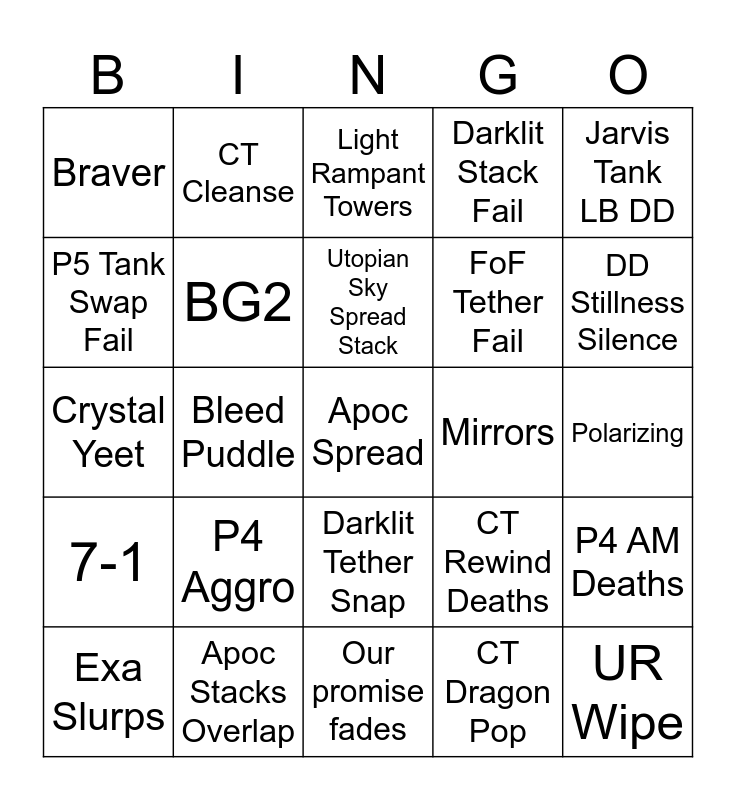 This bingo card has a free space and 24 words: P4 Aggro, Apoc Stacks Overlap, Utopian Sky Spread Stack, Exa Slurps, Jarvis Tank LB DD, Braver, P5 Tank Swap Fail, CT Cleanse, Mirrors, Darklit Tether Snap, FoF Tether Fail, Crystal Yeet, CT Rewind Deaths, P4 AM Deaths, BG2, CT Dragon Pop, Polarizing, Light Rampant Towers, DD Stillness Silence, Bleed Puddle, UR Wipe, 7-1, Darklit Stack Fail and Our promise fades.
