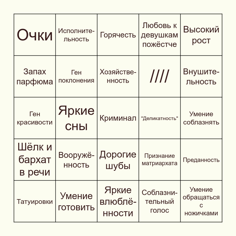 This bingo card has a free space and 24 words: Вооружё-нность, Умение готовить, Хозяйстве-нность, Татуировки, Высокий рост, Очки, Запах парфюма, Исполните-льность, "Деликатность", Дорогие шубы, ////, Ген красивости, Признание матриархата, Преданность, Ген поклонения, Соблазни-тельный голос, Умение соблазнять, Горячесть, Внушите-льность, Яркие сны, Умение обращаться с ножичками, Шёлк и бархат в речи, Любовь к девушкам пожёстче and Яркие влюблё-нности.