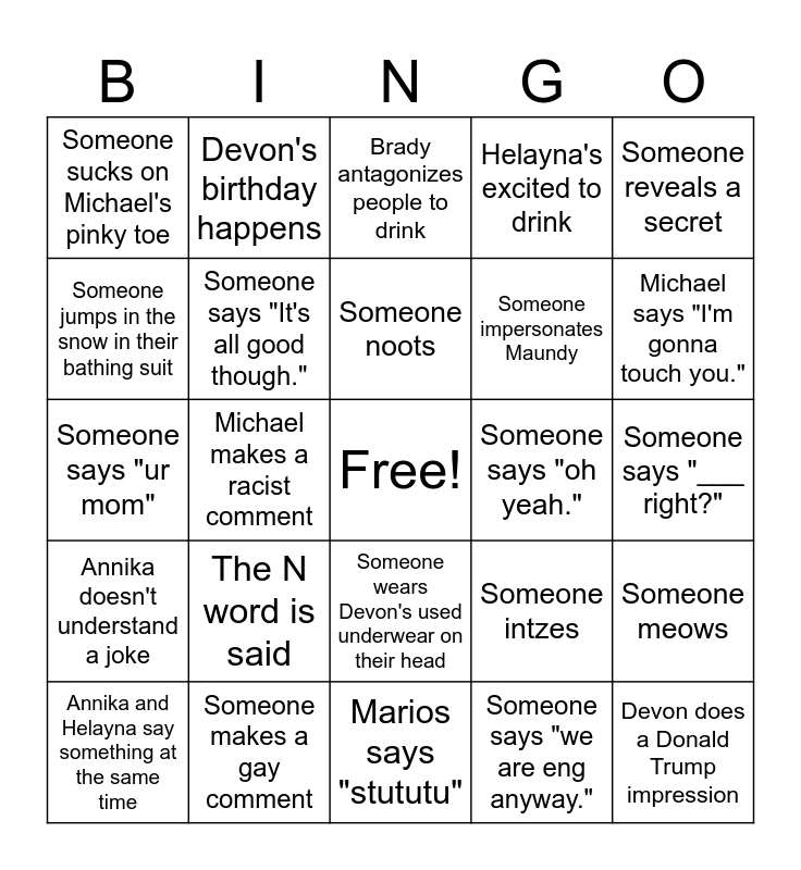 This bingo card has a free space and 24 words: The N word is said, Someone makes a gay comment, Someone noots, Annika and Helayna say something at the same time, Someone reveals a secret, Someone sucks on Michael's pinky toe, Someone jumps in the snow in their bathing suit, Devon's birthday happens, Someone says "oh yeah.", Someone wears Devon's used underwear on their head, Someone impersonates Maundy, Someone says "ur mom", Someone intzes, Someone meows, Someone says "It's all good though.", Someone says "we are eng anyway.", Someone says "___ right?", Brady antagonizes people to drink, Michael says "I'm gonna touch you.", Michael makes a racist comment, Devon does a Donald Trump impression, Annika doesn't understand a joke, Helayna's excited to drink and Marios says "stututu".