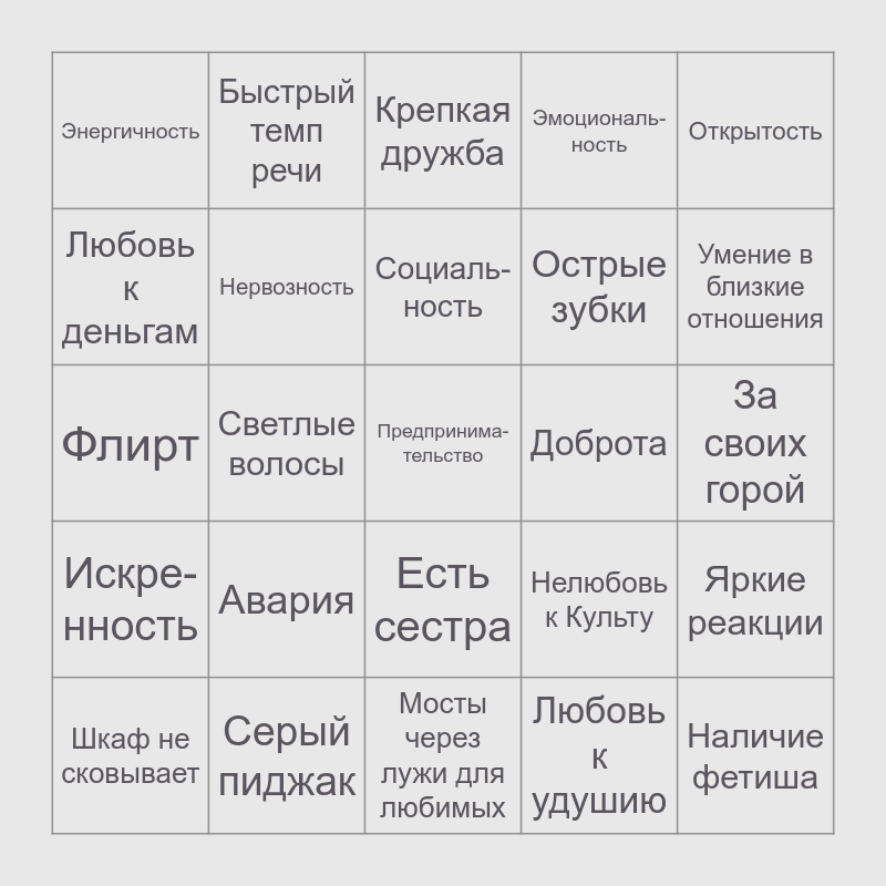 This bingo card has a free space and 24 words: Авария, Серый пиджак, Социаль-ность, Шкаф не сковывает, Открытость, Энергичность, Любовь к деньгам, Быстрый темп речи, Доброта, Есть сестра, Острые зубки, Флирт, Нелюбовь к Культу, Яркие реакции, Нервозность, Любовь к удушию, За своих горой, Крепкая дружба, Умение в близкие отношения, Светлые волосы, Наличие фетиша, Искре-нность, Эмоциональ-ность and Мосты через лужи для любимых.
