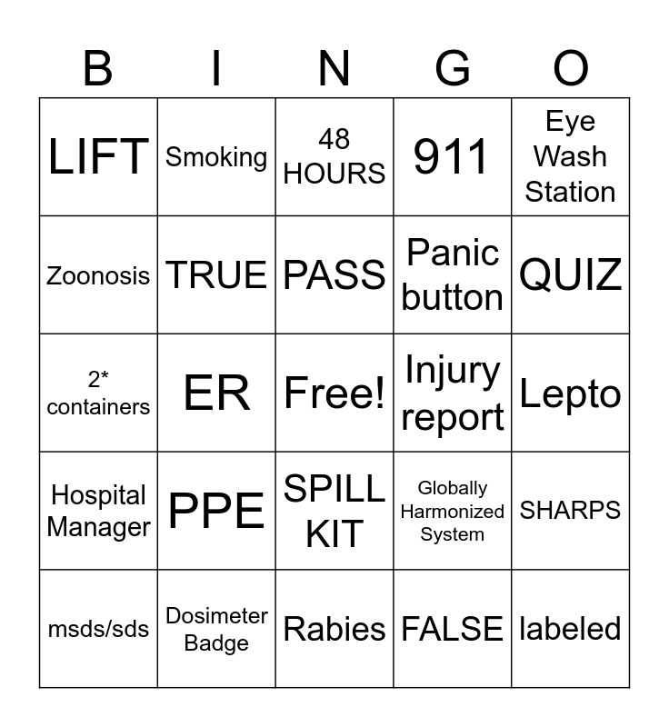This bingo card has a free space and 24 words: PPE, Dosimeter Badge, PASS, msds/sds, Eye Wash Station, LIFT, Zoonosis, Smoking, Injury report, SPILL KIT, Panic button, 2* containers, Globally Harmonized System, SHARPS, TRUE, FALSE, Lepto, 48 HOURS, QUIZ, ER, labeled, Hospital Manager, 911 and Rabies.