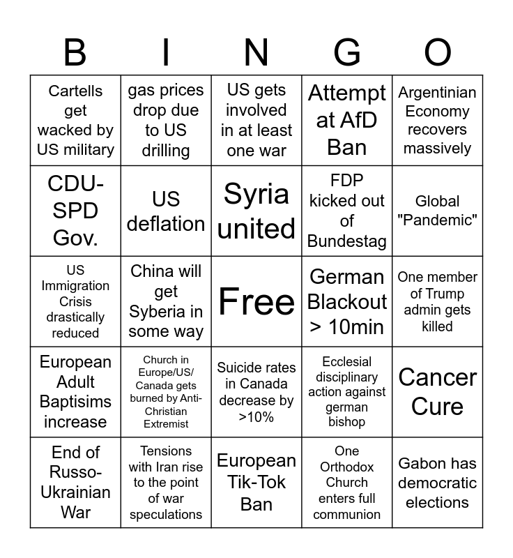 This bingo card has a free space and 24 words: End of Russo-Ukrainian War, Church in Europe/US/ Canada gets burned by Anti-Christian Extremist, Syria united, One Orthodox Church enters full communion, Argentinian Economy recovers massively, Cartells get wacked by US military, gas prices drop due to US drilling, US gets involved in at least one war, German Blackout > 10min, One member of Trump admin gets killed, US Immigration Crisis drastically reduced, US deflation, Ecclesial disciplinary action against german bishop, Cancer Cure, CDU-SPD Gov., Tensions with Iran rise to the point of war speculations, European Tik-Tok Ban, Attempt at AfD Ban, Global "Pandemic", European Adult Baptisims increase, China will get Syberia in some way, Suicide rates in Canada decrease by >10%, FDP kicked out of Bundestag and Gabon has democratic elections.