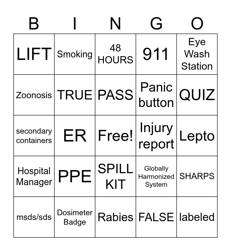 This bingo card has a free space and 24 words: PPE, Dosimeter Badge, PASS, msds/sds, Eye Wash Station, LIFT, Zoonosis, Smoking, Injury report, SPILL KIT, Panic button, secondary containers, Globally Harmonized System, SHARPS, TRUE, FALSE, Lepto, 48 HOURS, QUIZ, ER, labeled, Hospital Manager, 911 and Rabies.