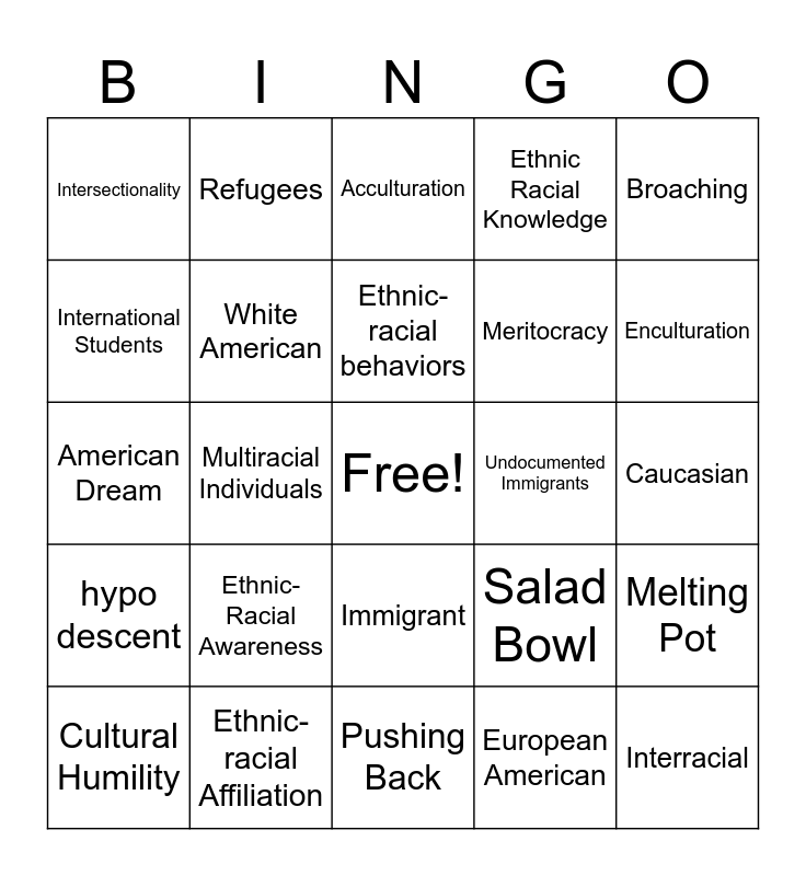 This bingo card has a free space and 24 words: Ethnic-Racial Awareness, Ethnic-racial Affiliation, Ethnic-racial behaviors, Cultural Humility, Broaching, Intersectionality, International Students, Refugees, Undocumented Immigrants, Immigrant, Meritocracy, American Dream, Salad Bowl, Melting Pot, White American, European American, Caucasian, Acculturation, Enculturation, Multiracial Individuals, Interracial, hypo descent, Ethnic Racial Knowledge and Pushing Back.