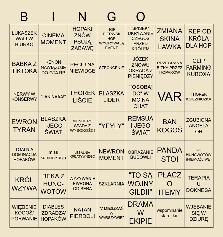 This bingo card has 49 words: PŁACZ O ITEMY, PRZEGRANA BITKA PRZEZ HOPAKÓW, DRAMA W EKIPIE, BLASZKA I JEGO ŚWIAT, THOREK LIŚCIE, ZGUBIONA ANGELA OH, CINEMA MOMENT, NATAN PIERDOLI, ZMIANA SKINA LAWKA, NEWRON MOMENT, -REP OD KRÓLA DLA HOP, HOP PIERWSI/ HOP WYGRYWAJĄ EVENT, VAR, "[OSOBA] DC" W MC NA CHAT, BEKA Z HUNC-WOTÓW, BAN KOGOŚ, BABKA Z TIKTOKA, CLIP FARMING KUBOXA, TERAPIA U DOKNESA, SPISEK/ UKRYWANIE CZEGOŚ PRZED KRÓLEM, JÓZEK ZNOWU OKRADA Z PIENIĘDZY, MENDERS SPADA Z WYSOKOŚCI, ŁUKASZEK WALI W BIURKO, KENON NAWIĄZUJE DO GTA RP, WIĘZIENIE KOGOŚ/ PORWANIE, PECIU NA NIEWIDCE, THOREK KSIĘŻNICZKA, DIABLES 'ZDRADZA' HOPAKÓW, BLASZKA LIDER, "JANINAAA!", WJEBANIE SIĘ W DZIURĘ, REMSUA I JEGO ŚWIAT, KRÓL WZYWA, WYZYWANIE EWRONA OD SERA, EWRON TYRAN, OBRAŻANIE BUDOWLI, PANDA STOI, >4 HUNCWOTÓW (NIEMOŻLIWE), NERWY W KONSERWY, JEBALNIA KREATYWNEGO, SZKLARNIA, TOALNIA DOMINACJA HOPAKÓW, "YFYLY", "7 MIESZKAŃ W WARSZAWIE", SZPONCENIE, HOPAKI ZNÓW PSUJĄ ZABAWĘ, "TO SĄ WOJNY GILDII", miss komunikacja and wspominanie starej km.
