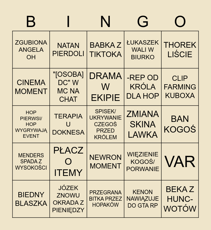 This bingo card has 25 words: PŁACZ O ITEMY, PRZEGRANA BITKA PRZEZ HOPAKÓW, DRAMA W EKIPIE, BIEDNY BLASZKA, THOREK LIŚCIE, ZGUBIONA ANGELA OH, CINEMA MOMENT, NATAN PIERDOLI, ZMIANA SKINA LAWKA, NEWRON MOMENT, -REP OD KRÓLA DLA HOP, HOP PIERWSI/ HOP WYGRYWAJĄ EVENT, WIĘZIENIE KOGOŚ/ PORWANIE, VAR, "[OSOBA] DC" W MC NA CHAT, BEKA Z HUNC-WOTÓW, BAN KOGOŚ, BABKA Z TIKTOKA, CLIP FARMING KUBOXA, TERAPIA U DOKNESA, SPISEK/ UKRYWANIE CZEGOŚ PRZED KRÓLEM, JÓZEK ZNOWU OKRADA Z PIENIĘDZY, MENDERS SPADA Z WYSOKOŚCI, ŁUKASZEK WALI W BIURKO and KENON NAWIĄZUJE DO GTA RP.