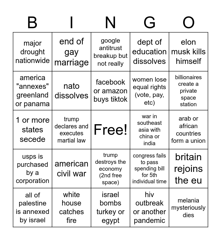 This bingo card has a free space and 24 words: american civil war, white house catches fire, facebook or amazon buys tiktok, all of palestine is annexed by israel, elon musk kills himself, major drought nationwide, america "annexes" greenland or panama, end of gay marriage, war in southeast asia with china or india, trump destroys the economy (2nd free space), women lose equal rights (vote, pay, etc), 1 or more states secede, congress fails to pass spending bill for 5th individual time, britain rejoins the eu, nato dissolves, hiv outbreak or another pandemic, arab or african countries form a union, google antitrust breakup but not really, billionaires create a private space station, trump declares and executes martial law, melania mysteriously dies, usps is purchased by a corporation, dept of education dissolves and israel bombs turkey or egypt.