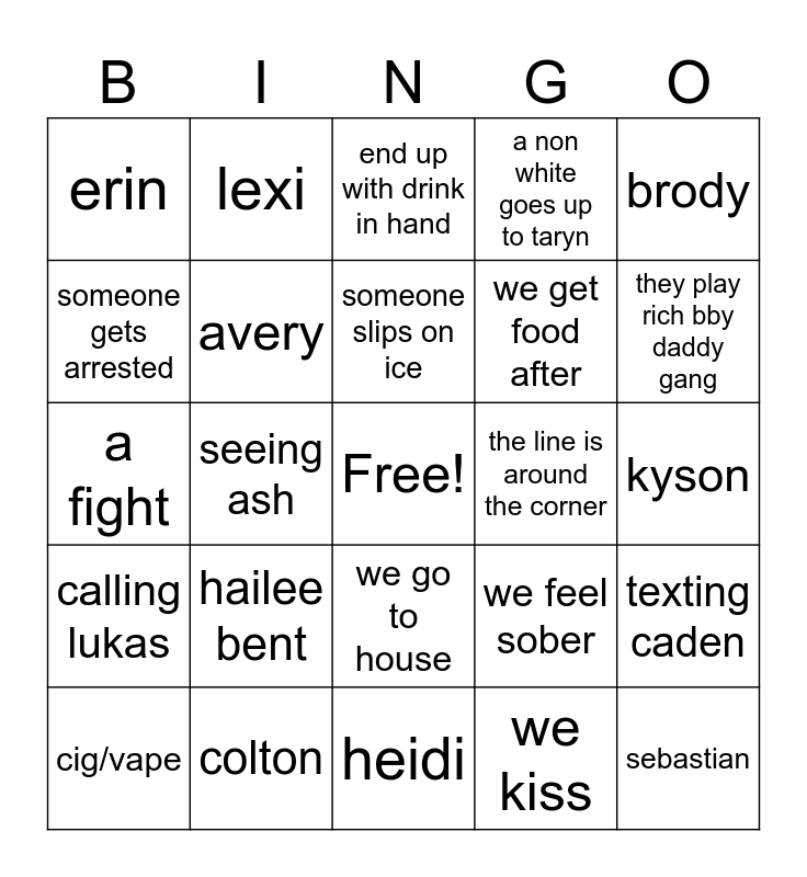 This bingo card has a free space and 24 words: hailee bent, colton, someone slips on ice, cig/vape, brody, erin, someone gets arrested, lexi, the line is around the corner, we go to house, we get food after, a fight, we feel sober, texting caden, avery, we kiss, kyson, end up with drink in hand, they play rich bby daddy gang, seeing ash, sebastian, calling lukas, a non white goes up to taryn and heidi.