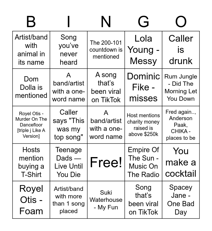 This bingo card has 26 words: Free!, Song that’s been viral on TikTok, A song that’s been viral on TikTok, Artist/band with more than 1 song placed, Caller is drunk, Artist/band with animal in its name, Dom Dolla is mentioned, Song you’ve never heard, Fred again.., Anderson Paak, CHIKA - places to be, Empire Of The Sun - Music On The Radio, Dominic Fike - misses, Royel Otis - Murder On The Dancefloor [triple j Like A Version], You make a cocktail, Royel Otis - Foam, Caller says "This was my top song", You win beer pong, Lola Young - Messy, Hosts mention buying a T-Shirt, The 200-101 countdown is mentioned, A band/artist with a one-word name, Rum Jungle - Did The Morning Let You Down, Suki Waterhouse - My Fun, Host mentions charity money raised is above $250k, Teenage Dads — Live Until You Die, A band/artist with a one-word name and Spacey Jane - One Bad Day.