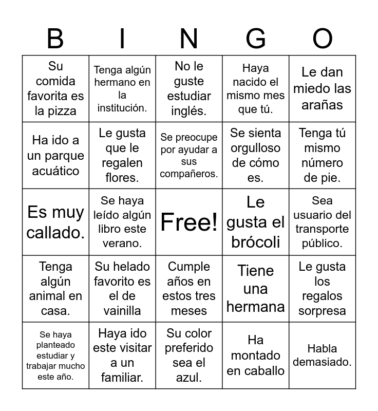 This bingo card has a free space and 70 words: Cuyo color favorito sea el amarillo., Se haya leído algún libro este verano., Tenga más de tres hermanos., Le guste el reggaetón., Sea usuario del transporte público., Haya visitado una ciudad en estas vacaciones., Tenga algún hermano en la institución., Quiera estudiar en la Universidad., Se sienta orgulloso de cómo es., Le guste el cine de terror., Le den miedo las tormentas., Monte en bicicleta.,, No le guste estudiar inglés., Haya nacido el mismo mes que tú., Se duerma más tarde de las doce de la noche., Tenga algún animal en casa., Haya ido este visitar a un familiar., Se preocupe por ayudar a sus compañeros., Le guste bailar., Tenga tú mismo número de pie., Se haya planteado estudiar y trabajar mucho este año., Toque un instrumento musical., Su color preferido sea el azul., Tiene una hermana, Tiene dos mascotas o más, Tiene el pelo rizado, Tenga tú mismo tamaño de mano., Ha visto una peli de comedia., Le gusta el brócoli, Es zurdo, Su comida favorita es la pizza, Ha viajado a otro a país, Su helado favorito es el de chocolate, Su cumpleaños es en agosto, Le gusta hacer manualidades, Va al colegio caminando., Lleva puesto algo azul, Su asignatura favorita es matemáticas, Ha montado en caballo, Le dan miedo las arañas, Le da miedo las alturas., Su helado favorito es el de vainilla, Cumple años en estos tres meses, No le guste el pescado., Está en un equipo de deporte, Ha ido a un parque acuático, Ha jugado al escondite, Le gusta las películas infantiles, Su color preferido sea el violeta., Tiene una prenda de color negro., Su color favorito es el rosado, Lleva gafas, Le gusta salir a pasear., Le gustan los peluches, Le gusta los regalos sorpresa, Es buena gente con todos, Le gusta que le regalen flores., Lleva su cabello recogido., Le gusta la salsa., Habla demasiado., Es muy callado., Lleva su cabello siempre suelto, Siempre esta dispuesto a colaborar., le gusta el color fucsia, le gustan los colores opacos, Ama dibujar., Le gusta el color naranja., Le gusta maquillarse., No usa su celular en clase. and Ama contar historias.