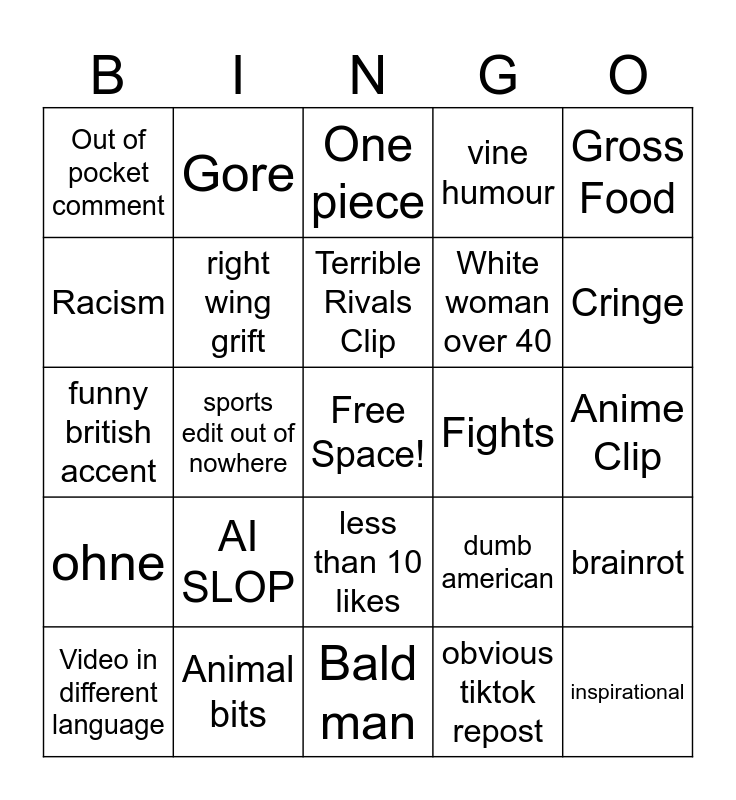 This bingo card has a free space and 24 words: AI SLOP, Animal bits, Terrible Rivals Clip, Video in different language, Gross Food, Out of pocket comment, Racism, Gore, Fights, less than 10 likes, White woman over 40, funny british accent, dumb american, brainrot, right wing grift, obvious tiktok repost, Anime Clip, One piece, Cringe, sports edit out of nowhere, inspirational, ohne, vine humour and Bald man.