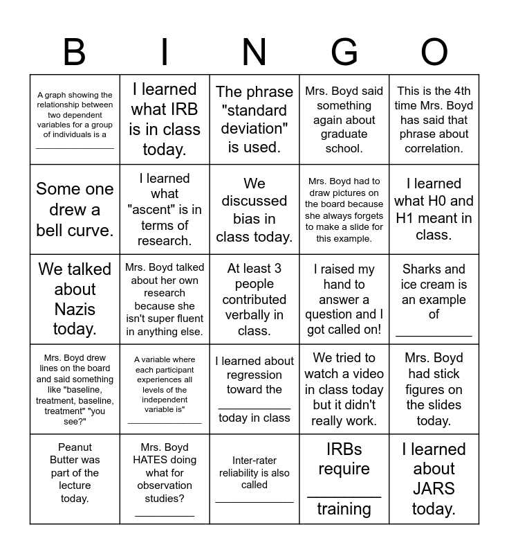 This bingo card has 1 images, a free space and 73 words: Mrs. Boyd says, "Does that make sense?", Mrs. Boyd says, "K" repeatedly., The phrase "standard deviation" is used., I verbally contributed to class., There was a technical difficulty of some sort., Mrs. Boyd talks about a topic only to see that it is on the next slide..., Someone cracks a nerdy joke about statistics that no one really gets., I asked a question in class., Peanut Butter was part of the lecture today., A question was asked and no one answered., Mrs. Boyd said something confusing so I asked for clarification., We talked about some REALLY weird research that has been published., We discussed bias in class today., Some one drew a bell curve., Mrs. Boyd referred to one of her children in class., Mrs. Boyd talked about her own research because she isn't super fluent in anything else., Mrs. Boyd said something a 13 year old would say. Like, "cutsie and demur.", I learned what H0 and H1 meant in class., We talked about an STD in class., We talked about Nazis today., I learned what "ascent" is in terms of research., I learned what IRB is in class today., Mrs. Boyd said something again about graduate school., Someone asked a question completely unrelated to class., I learned about JARS today., We talked about sad things that have happened with animals., We talked about Confederates! Yes, Confederates!, Mrs. Boyd has that one crazy hair sticking out behind her glasses and ear...and she knows but isn't fixing it., The term "APA" was used 4 or more times in this class period., The phrase "small-n" was used in lecture., This is the 4th time Mrs. Boyd has said that phrase about correlation., We talked about the "third-variable problem.", We learned what other term for "confounding variable"? _____________, The difference between quasi and true experiments is: _____________, There are _____ categories of IRB., IRBs require ________ training, The Rock is used as an example of: ____________, Parsimony is similar to what old adage? ____________, Applied researchers are often worried about ________validity, The higher the external validity the lower the _____________, Inter-rater reliability is also called ______________, Mrs. Boyd HATES doing what for observation studies? __________, Mrs. Boyd said a cuss word...maybe more than once this course., The goal of a _____________ is to gain insight into and understanding of a single individual’s, A graph showing the relationship between two dependent variables for a group of individuals is a _________________, We never accept we _____________, A variable where each participant experiences all levels of the independent variable is" ________________, 2 IVs with 2 Levels and we are looking for an interaction. You would run an ______________, Mrs. Boyd talked about sharks and ice cream for the 3rd time!, Mrs. Boyd talked about sharks and ice cream for the first time., Mrs. Boyd talked about sharks and ice cream for the second time..., Sharks and ice cream is an example of ___________, In factorial designs there is ______________ variables. Hint (it is 3 words), A variable where each participant experiences all levels of the independent variable? T. or. F., Pre-test Post-test is a type of _____________, I learned about regression toward the ___________ today in class, Attrition is also called _________, Longitudinal designs treat age as a ___________ design., Mrs. Boyd had stick figures on the slides today., Mrs. Boyd had to draw pictures on the board because she always forgets to make a slide for this example., Discrete trials are a type of __________ design, Mrs. Boyd drew lines on the board and said something like "baseline, treatment, baseline, treatment" "you see?", I raised my hand to answer a question but so many other people raised their hand I didn't get called on., I raised my hand to answer a question and I got called on!, p-value= __________, Is something is statistically significant the p-value will be at _________ or less., We watched a video in class today., We tried to watch a video in class today but it didn't really work., We talked about tails in class., We got to leave a little early today., Mrs. Boyd was a little late today., Mrs. Boyd checked the thermostat and We got a hand out in class today..
