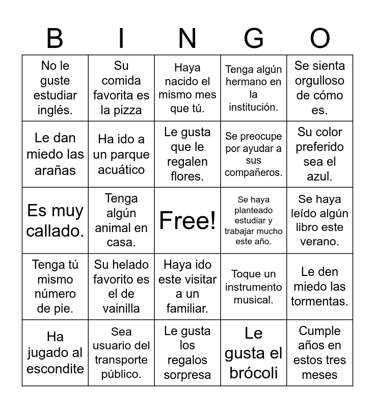 This bingo card has a free space and 70 words: Cuyo color favorito sea el amarillo., Se haya leído algún libro este verano., Tenga más de tres hermanos., Le guste el reggaetón., Sea usuario del transporte público., Haya visitado una ciudad en estas vacaciones., Tenga algún hermano en la institución., Quiera estudiar en la Universidad., Se sienta orgulloso de cómo es., Le guste el cine de terror., Le den miedo las tormentas., Monte en bicicleta.,, No le guste estudiar inglés., Haya nacido el mismo mes que tú., Se duerma más tarde de las doce de la noche., Tenga algún animal en casa., Haya ido este visitar a un familiar., Se preocupe por ayudar a sus compañeros., Le guste bailar., Tenga tú mismo número de pie., Se haya planteado estudiar y trabajar mucho este año., Toque un instrumento musical., Su color preferido sea el azul., Tiene una hermana, Tiene dos mascotas o más, Tiene el pelo rizado, Tenga tú mismo tamaño de mano., Ha visto una peli de comedia., Le gusta el brócoli, Es zurdo, Su comida favorita es la pizza, Ha viajado a otro a país, Su helado favorito es el de chocolate, Su cumpleaños es en agosto, Le gusta hacer manualidades, Va al colegio caminando., Lleva puesto algo azul, Su asignatura favorita es matemáticas, Ha montado en caballo, Le dan miedo las arañas, Le da miedo las alturas., Su helado favorito es el de vainilla, Cumple años en estos tres meses, No le guste el pescado., Está en un equipo de deporte, Ha ido a un parque acuático, Ha jugado al escondite, Le gusta las películas infantiles, Su color preferido sea el violeta., Tiene una prenda de color negro., Su color favorito es el rosado, Lleva gafas, Le gusta salir a pasear., Le gustan los peluches, Le gusta los regalos sorpresa, Es buena gente con todos, Le gusta que le regalen flores., Lleva su cabello recogido., Le gusta la salsa., Habla demasiado., Es muy callado., Lleva su cabello siempre suelto, Siempre esta dispuesto a colaborar., le gusta el color fucsia, le gustan los colores opacos, Ama dibujar., Le gusta el color naranja., Le gusta maquillarse., No usa su celular en clase. and Ama contar historias.