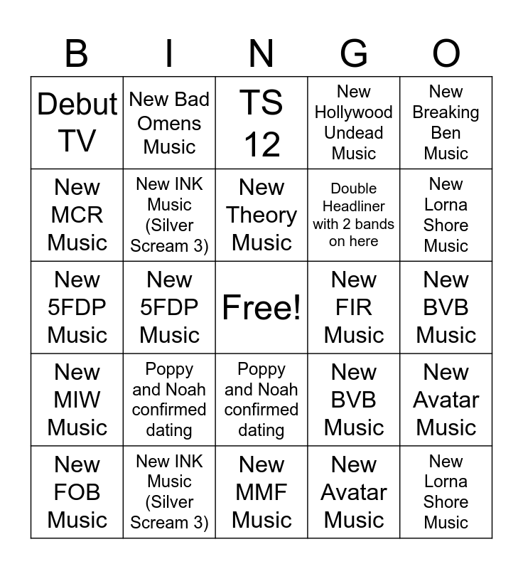 This bingo card has a free space and 48 words: REP TV, New Lorna Shore Music, New FOB Music, New MMF Music, Poppy and Noah confirmed dating, New MIW Music, New Bad Omens Music, Triple Headliner with 2 bands on here, New MCR Music, New Make Them Suffer Music, New INK Music (Silver Scream 3), New Hollywood Undead Music, New Avatar Music, New BVB Music, New Ronnie scandal, New AA Music, New Theory Music, New FIR Music, TS 12, New Breaking Ben Music, New 5FDP Music, New Avatar Music, Debut TV, Double Headliner with 2 bands on here, REP TV, New Lorna Shore Music, New FOB Music, New MMF Music, Poppy and Noah confirmed dating, New MIW Music, New Bad Omens Music, Triple Headliner with 2 bands on here, New MCR Music, New Make Them Suffer Music, New INK Music (Silver Scream 3), New Hollywood Undead Music, New PROJECT: VENGEANCE Music, New BVB Music, New Ronnie scandal, New AA Music, New Theory Music, New FIR Music, TS 12, New Breaking Ben Music, New 5FDP Music, New Avatar Music, Debut TV and Double Headliner with 2 bands on here.