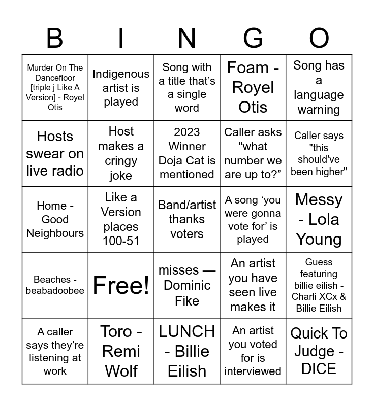 This bingo card has 25 words: Free!, LUNCH - Billie Eilish, 2023 Winner Doja Cat is mentioned, A caller says they’re listening at work, Song has a language warning, Murder On The Dancefloor [triple j Like A Version] - Royel Otis, Hosts swear on live radio, Indigenous artist is played, A song ‘you were gonna vote for’ is played, misses — Dominic Fike, Caller asks "what number we are up to?”, Home - Good Neighbours, An artist you have seen live makes it, Guess featuring billie eilish - Charli XCx & Billie Eilish, Host makes a cringy joke, Quick To Judge - DICE, Messy - Lola Young, Song with a title that’s a single word, Caller says "this should've been higher", Like a Version places 100-51, Band/artist thanks voters, Toro - Remi Wolf, Beaches - beabadoobee, Foam - Royel Otis and An artist you voted for is interviewed.
