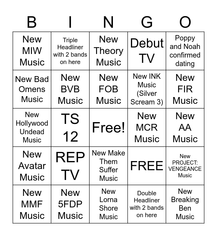 This bingo card has a free space and 25 words: REP TV, New Lorna Shore Music, New FOB Music, New MMF Music, Poppy and Noah confirmed dating, New MIW Music, New Bad Omens Music, Triple Headliner with 2 bands on here, New MCR Music, New Make Them Suffer Music, New INK Music (Silver Scream 3), New Hollywood Undead Music, FREE, New PROJECT: VENGEANCE Music, New BVB Music, New Ronnie scandal, New AA Music, New Theory Music, New FIR Music, TS 12, New Breaking Ben Music, New 5FDP Music, New Avatar Music, Debut TV and Double Headliner with 2 bands on here.