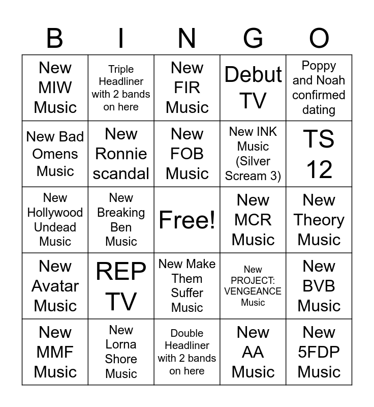 This bingo card has a free space and 24 words: REP TV, New Lorna Shore Music, New FOB Music, New MMF Music, Poppy and Noah confirmed dating, New MIW Music, New Bad Omens Music, Triple Headliner with 2 bands on here, New MCR Music, New Make Them Suffer Music, New INK Music (Silver Scream 3), New Hollywood Undead Music, New PROJECT: VENGEANCE Music, New BVB Music, New Ronnie scandal, New AA Music, New Theory Music, New FIR Music, TS 12, New Breaking Ben Music, New 5FDP Music, New Avatar Music, Debut TV and Double Headliner with 2 bands on here.