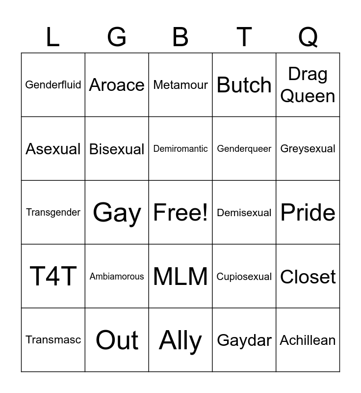 This bingo card has a free space and 50 words: Abrosexual, Achillean, Agender, Ally, Ambiamorous, Androgynous, Aroace, Aromantic, Asexual, Bigender, Bisexual, Butch, Closet, Cupiosexual, Demiboy, Demigirl, Demiromantic, Demisexual, Drag King, Drag Queen, Gay, Gaydar, Genderfluid, Genderqueer, GNC, Greyromantic, Greysexual, Lesbian, Metamour, MLM, Monogamous, Neptunic, Nonbinary, Omnisexual, Out, Pansexual, Polyamorous, Polycule, Polysexual, Pride, Queer, Questioning, Sapphic, Transfemme, Transmasc, Transgender, Transition, Two-Spirit, T4T and Unlabled.