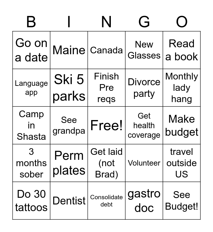 This bingo card has a free space and 24 words: Perm plates, Dentist, Finish Pre reqs, Do 30 tattoos, Read a book, Go on a date, Language app, Maine, Get health coverage, Get laid (not Brad), Divorce party, Camp in Shasta, Volunteer, travel outside US, Ski 5 parks, gastro doc, Make budget, Canada, Monthly lady hang, See grandpa, See Budget!, 3 months sober, New Glasses and Consolidate debt.