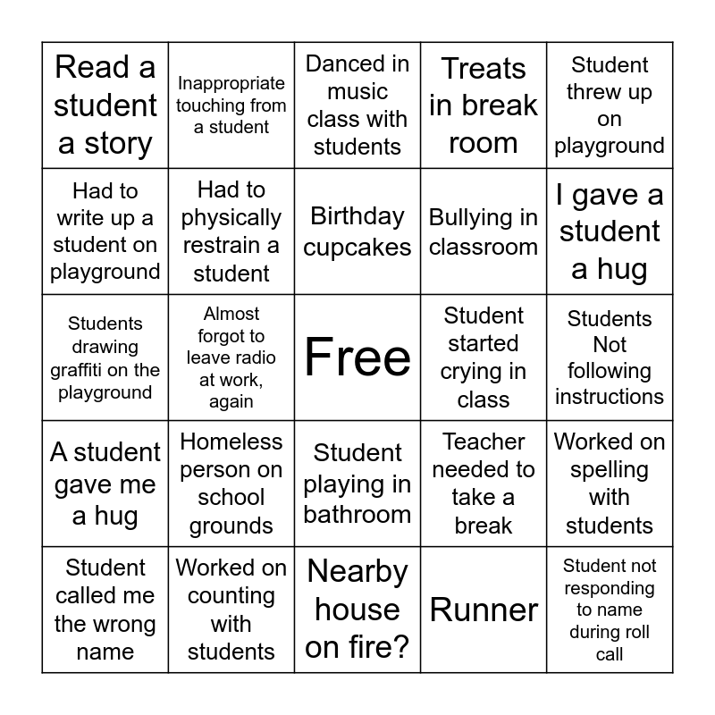 This bingo card has a free space and 24 words: Homeless person on school grounds, Worked on counting with students, Birthday cupcakes, Student called me the wrong name, Student threw up on playground, Read a student a story, Had to write up a student on playground, Inappropriate touching from a student, Student started crying in class, Student playing in bathroom, Bullying in classroom, Students drawing graffiti on the playground, Teacher needed to take a break, Worked on spelling with students, Had to physically restrain a student, Runner, Students Not following instructions, Danced in music class with students, I gave a student a hug, Almost forgot to leave radio at work, again, Student not responding to name during roll call, A student gave me a hug, Treats in break room and Nearby house on fire?.