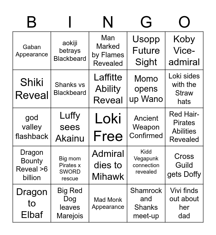 This bingo card has a free space and 24 words: Dragon to Elbaf, Big mom Pirates x SWORD rescue, Laffitte Ability Reveal, Shamrock and Shanks meet-up, Koby Vice-admiral, Gaban Appearance, aokiji betrays Blackbeard, Man Marked by Flames Revealed, Ancient Weapon Confirmed, Red Hair-Pirates Abilities Revealed, god valley flashback, Shanks vs Blackbeard, Kidd Vegapunk connection revealed, Cross Guild gets Doffy, Shiki Reveal, Big Red Dog leaves Marejois, Mad Monk Appearance, Usopp Future Sight, Loki sides with the Straw hats, Dragon Bounty Reveal >6 billion, Luffy sees Akainu, Admiral dies to Mihawk, Momo opens up Wano and Vivi finds out about her dad.