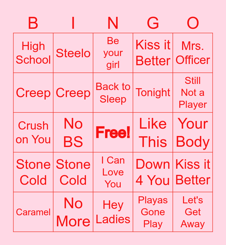 This bingo card has a free space and 38 words: All This Luv, Mrs. Officer, No BS, Creep, Kiss it Better, Stone Cold, Back to Sleep, All this Luv, Mrs. Officer, Tonight, No BS, Kiss it Better, Let's Get Away, Your Body, Creep, Stone Cold, Back to sleep, Be your girl, In Luv with a Stripper, Like This, High School, No More, Still Not a Player, Caramel, Bossy, Hey Ladies, Kitty Kat, Temptation, Movin On', Nothins Free, Foolish, I Can Love You, Playas Gone Play, Steelo, Case of the Ex, Down 4 You, Crush on You and Play No Games.