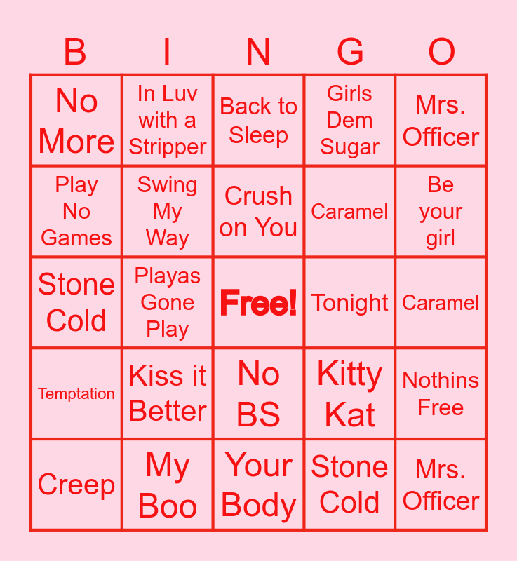 This bingo card has a free space and 44 words: All This Luv, Mrs. Officer, No BS, Creep, Kiss it Better, Stone Cold, Back to Sleep, All this Luv, Mrs. Officer, My Boo, Girls Dem Sugar, Tonight, No BS, Kiss it Better, Let's Get Away, Your Body, Creep, Stone Cold, Back to sleep, Be your girl, In Luv with a Stripper, Like This, High School, No More, Still Not a Player, Caramel, Bossy, Hey Ladies, Kitty Kat, Temptation, Movin On', Nothins Free, Foolish, I Can Love You, Playas Gone Play, Steelo, Case of the Ex, Down 4 You, Crush on You, Play No Games, Caramel, Sick of Being Lonely, Swing My Way and Lovers and Friends.