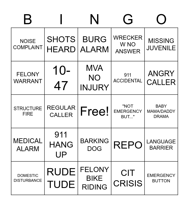 This bingo card has a free space and 24 words: 911 HANG UP, RUDE TUDE, MVA NO INJURY, DOMESTIC DISTURBANCE, MISSING JUVENILE, NOISE COMPLAINT, FELONY WARRANT, SHOTS HEARD, "NOT EMERGENCY BUT...", BARKING DOG, 911 ACCIDENTAL, STRUCTURE FIRE, REPO, LANGUAGE BARRIER, 10-47, CIT CRISIS, BABY MAMA/DADDY DRAMA, BURG ALARM, ANGRY CALLER, REGULAR CALLER, EMERGENCY BUTTON, MEDICAL ALARM, WRECKER W NO ANSWER and FELONY BIKE RIDING.