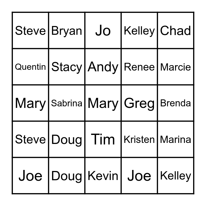 This bingo card has 25 words: Doug, Kevin, Andy, Joe, Chad, Steve, Quentin, Bryan, Greg, Tim, Renee, Mary, Kristen, Marina, Stacy, Kelley, Brenda, Jo, Marcie, Sabrina, Mary, Doug, Steve, Kelley and Joe.