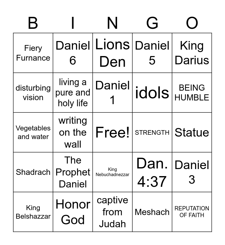 This bingo card has a free space and 29 words: King Belshazzar, Fingers of a human hand, writing on the wall, Jesus, Fiery Furnance, Lions Den, living a pure and holy life, The Prophet Daniel, STRENGTH, Honor God, Statue, REPUTATION OF FAITH, captive from Judah, Meshach, BEING HUMBLE, COURAGE, King Nebuchadnezzar, Shadrach, King Darius, Vegetables and water, Dan. 4:37, Abednego, idols, disturbing vision, Daniel 5, Daniel 6, Daniel 3, Daniel 1 and Obedience.