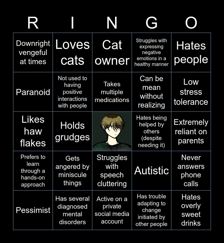 This bingo card has a free space and 24 words: Gets angered by miniscule things, Has several diagnosed mental disorders, Takes multiple medications, Pessimist, Hates people, Downright vengeful at times, Paranoid, Loves cats, Hates being helped by others (despite needing it), Struggles with speech cluttering, Can be mean without realizing, Likes haw flakes, Autistic, Never answers phone calls, Not used to having positive interactions with people, Has trouble adapting to change initiated by other people, Extremely reliant on parents, Cat owner, Low stress tolerance, Holds grudges, Hates overly sweet drinks, Prefers to learn through a hands-on approach, Struggles with expressing negative emotions in a healthy manner and Active on a private social media account.
