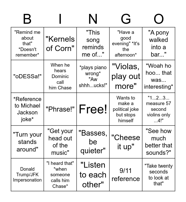 This bingo card has a free space and 24 words: "Get your head out of the music", "I heard that" *when someone calls him Chase*, *plays piano wrong* "Aw shhh...ucks!", Donald Trump/JFK Impersonation, "A pony walked into a bar...", "Remind me about that" *Doesn't remember*, "oDESSa!", "Kernels of Corn", Wants to make a political joke but stops himself, "Basses, be quieter", "Violas, play out more", *Reference to Michael Jackson joke*, "Cheese it up", "See how much better that sounds?", When he hears Dominic call him Chase, 9/11 reference, "1...2...3... measure 57 second violins only ...4!", "This song reminds me of...", "Woah ho hoo... that was... interesting", "Phrase!", "Take twenty seconds to look at that", "Turn your stands around", "Have a good evening" *It's the afternoon* and "Listen to each other".