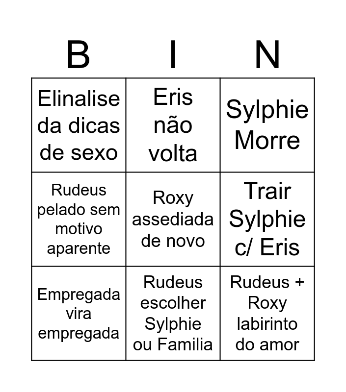 This bingo card has a free space and 8 words: Trair Sylphie c/ Eris, Sylphie Morre, Eris não volta, Empregada vira empregada, Elinalise da dicas de sexo, Rudeus + Roxy labirinto do amor, Rudeus pelado sem motivo aparente and Rudeus escolher Sylphie ou Familia.