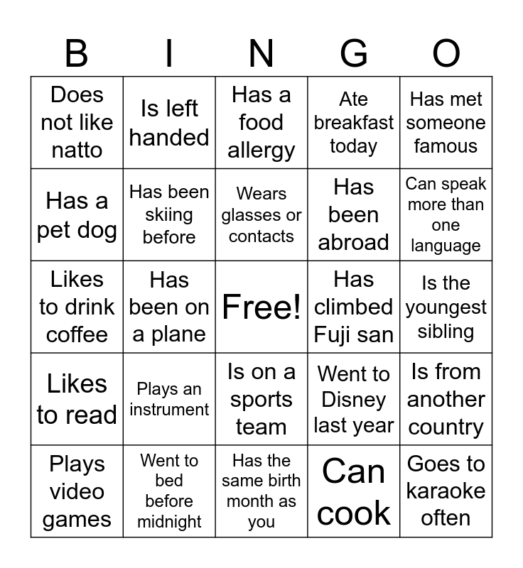 This bingo card has a free space and 24 words: Plays an instrument, Went to bed before midnight, Wears glasses or contacts, Plays video games, Has met someone famous, Does not like natto, Has a pet dog, Is left handed, Has climbed Fuji san, Is on a sports team, Has been abroad, Likes to drink coffee, Went to Disney last year, Is from another country, Has been skiing before, Can cook, Is the youngest sibling, Has a food allergy, Can speak more than one language, Has been on a plane, Goes to karaoke often, Likes to read, Ate breakfast today and Has the same birth month as you.
