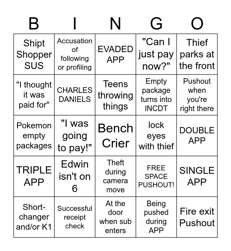 This bingo card has 25 words: Edwin isn't on 6, At the door when sub enters, Teens throwing things, Short-changer and/or K1, Thief parks at the front, Shipt Shopper SUS, "I thought it was paid for", Accusation of following or profiling, lock eyes with thief, Theft during camera move, Empty package turns into INCDT, Pokemon empty packages, FREE SPACE PUSHOUT!, SINGLE APP, CHARLES DANIELS, Fire exit Pushout, DOUBLE APP, EVADED APP, Pushout when you're right there, "I was going to pay!", Bench Crier, Successful receipt check, TRIPLE APP, "Can I just pay now?" and Being pushed during APP.